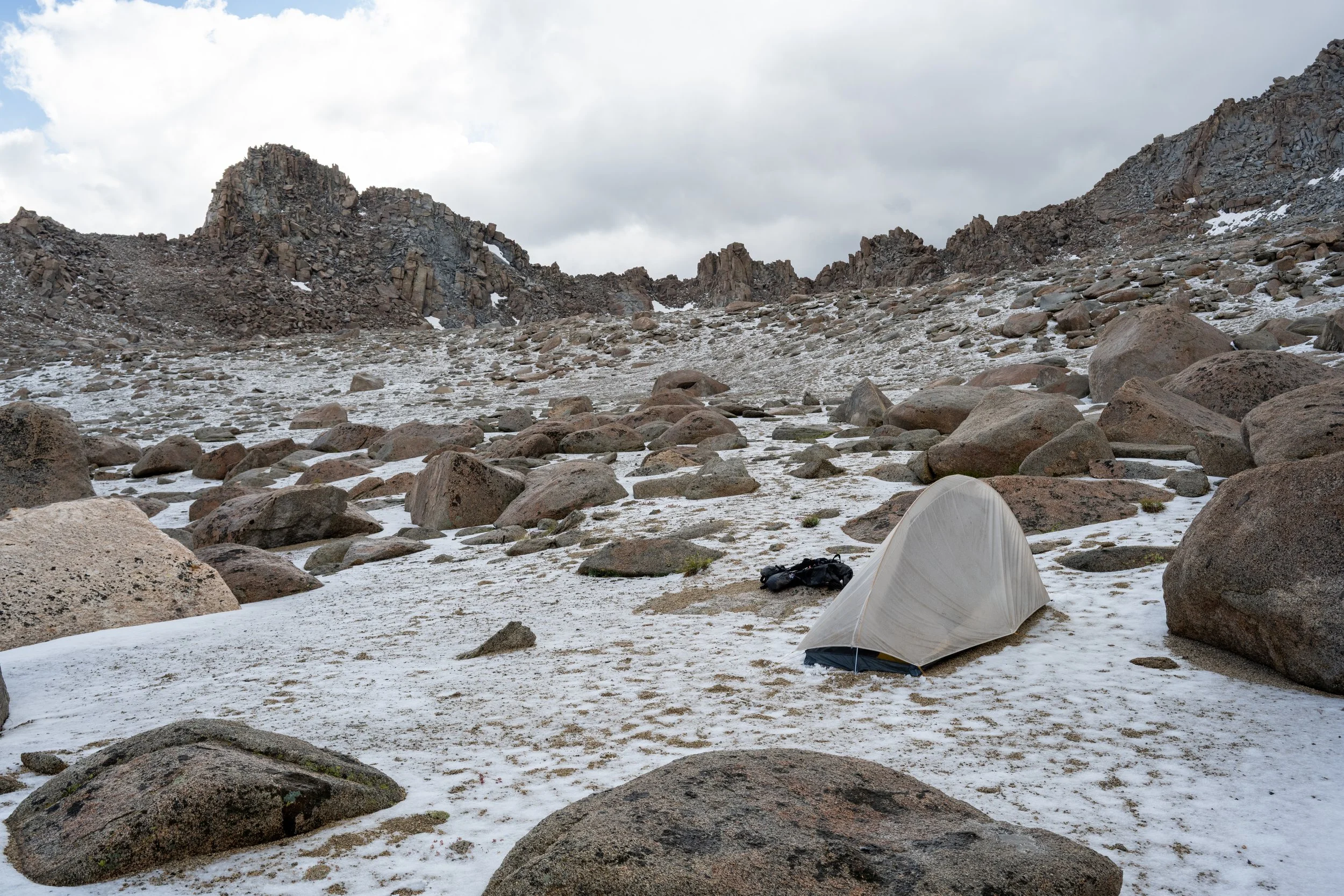 On the first day, I got a late start from the North Lake trailhead and didn’t hit the trail until around 9AM. By the time I made it to the switchbacks above Upper Lamarck Lake, I could see angry clouds forming in the distance over Lamarck Col. If I had to do this part over again, I’d have probably waited at the treeline at the upper lake for as long as I needed to until all of the storm systems passed. Instead, I pressed on against my better judgment. A light drizzle greeted me in the wide, flat expanse of sand and boulders just below Lamarck Col on its north side. I could push on and hope to make it into Darwin Canyon before any adverse weather hit, but I had really wanted to photograph sunrise on the summit of Mt. Lamarck and would be much better positioned to do that by camping on the north side.