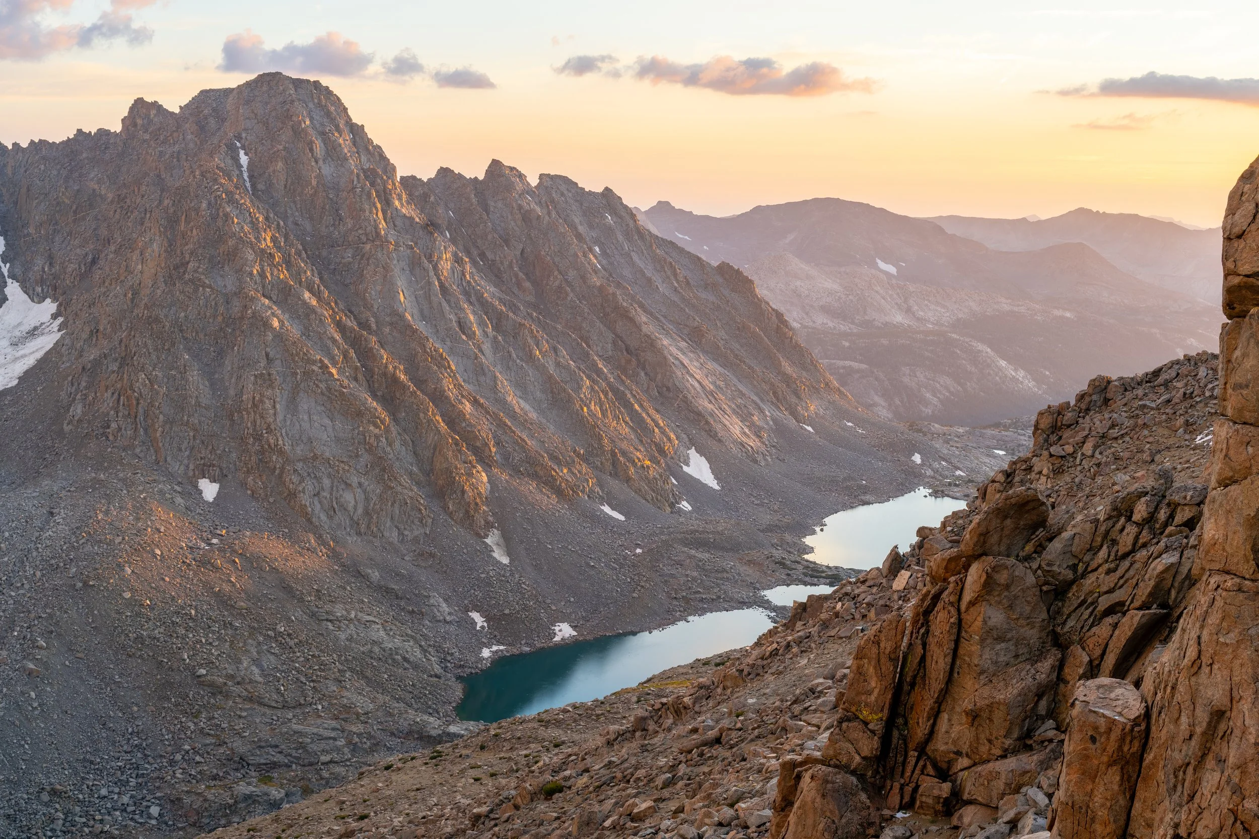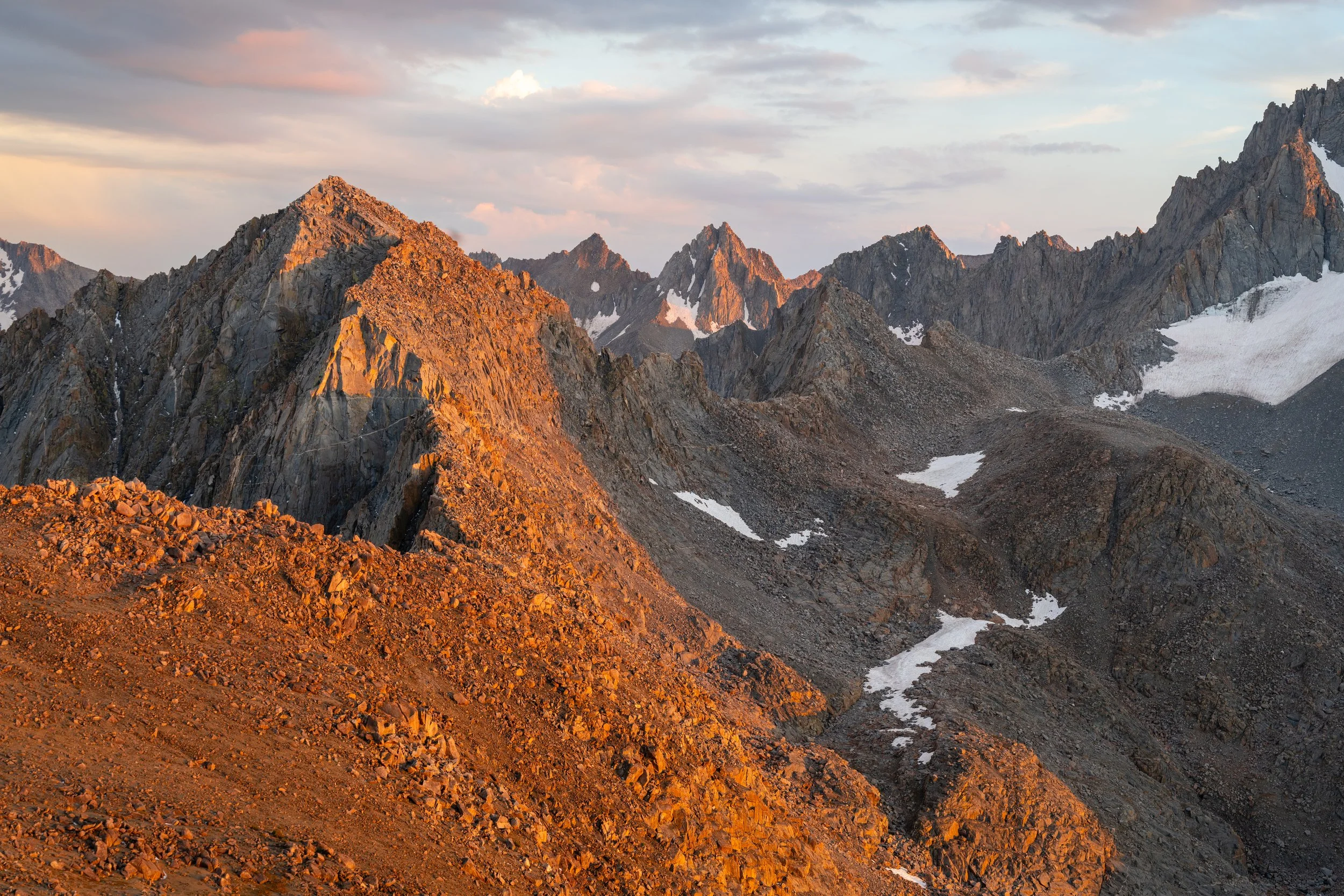By the time I finished setting up my tent against some large boulders, a heavy downpour of hail started. The time between flashes of lightning and claps of thunder narrowed until there was no gap at all. In hindsight, it’s hard to say objectively how much danger I was really in. I was surrounded by peaks and ridgelines on all sides, several of which I did witness get struck. I was in a relatively wide open field, but there were large rock formations ensuring that my tent was not the tallest thing around. I was freaked out enough to start thinking about my plan of action if I felt static electricity start to build in my tent. In the end, the first storm passed after an hour; I went out to explore the hail-covered landscape, watched a group of four head over Lamarck Col (their goal was Mt. Darwin the next day); a second storm cell hit about an hour later. The swirling clouds made for interesting sunset views from Lamarck Col.